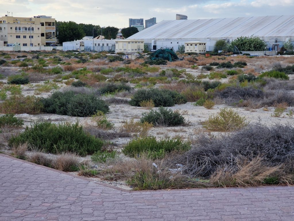 On my recent visit to Dubai, I found another Brownfield site (abandoned development might be more accurate) where some interesting natural regeneration is occurring. Like most such places, it is presumably awaiting redevelopment. This particular area is located in Bur Dubai, next to Creek Park. If you’ve read any of my older posts, you will know I make a study of such places, for they are great indicators of emergent hybrid ecosystems, which are the world’s future resilience. I’ll put links to some other articles at the end of this one.